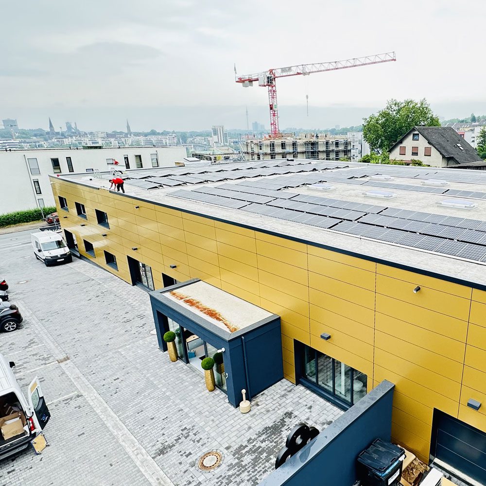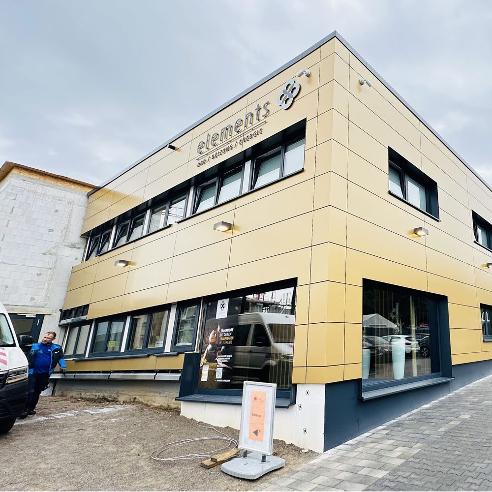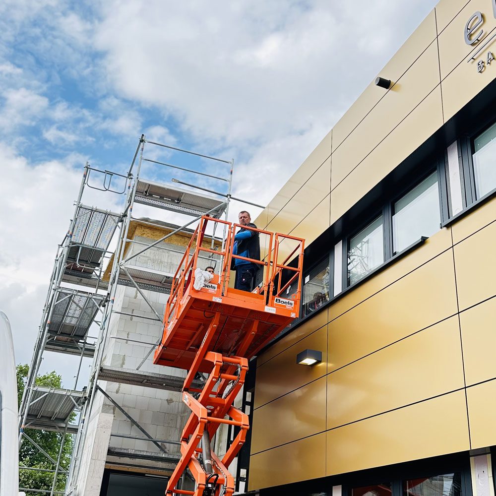 Hierbei handelt es sich um eine spaziele Hinterbefüftete Fassade Eine hinterlüftete Trespa-Fassade ist eine Fassadenverkleidung, bei der Trespa-Platten auf einer Unterkonstruktion befestigt werden und zwischen den Platten und der darunterliegenden Wand eine Hinterlüftungsebene entsteht. Diese Bauweise bietet mehrere Vorteile, wie verbesserte Wärmedämmung, Feuchtigkeitsregulierung und Schutz vor Witterungseinflüssen Besonderheit bei der Montage ist hierbei die exakte Ausrichtung der Unterkonstruktion, Horizontak sowie Vertikal Achsen sind hier Unter Lasertechnik ausgerichtet worden.